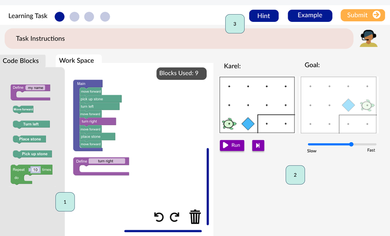 Beispielsweise sollen Schüler*innen in einer Lerneinheit durch Kombinieren von Befehlen, die als Blöcke zur Auswahl stehen, ein Programm erstellen, um damit eine Spielfigur zu steuern (s. Schildkröte in Abb. 1). Die Spielfigur soll etwa dazu gebracht werden, ein Objekte einzusammeln und sich dann zur Zielposition zu bewegen. Dabei können die Schüler*innen ihre programmierte Lösung immer wieder mithilfe einer Testmöglichkeit selbst überprüfen, unterstützendes Feedback erhalten und unter Nutzung von Lernmaterialien weiter verbessern.